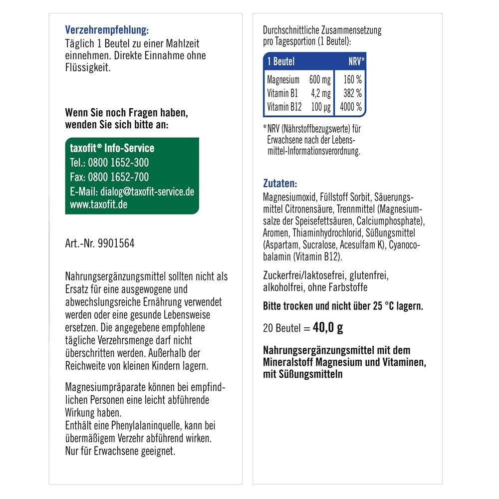 Magnesiumoxid, Füllstoff Sorbit, Säuerungsmittel Citronensäure, Trennmittel (Magnesiumsalze der Speisefettsäuren, Calciumphosphate), Aromen, Thiaminhydrochlorid, Süßungsmittel (Aspartam, Sucralose, Acesulfam K), Cyanocobalamin (Vitamin 812).