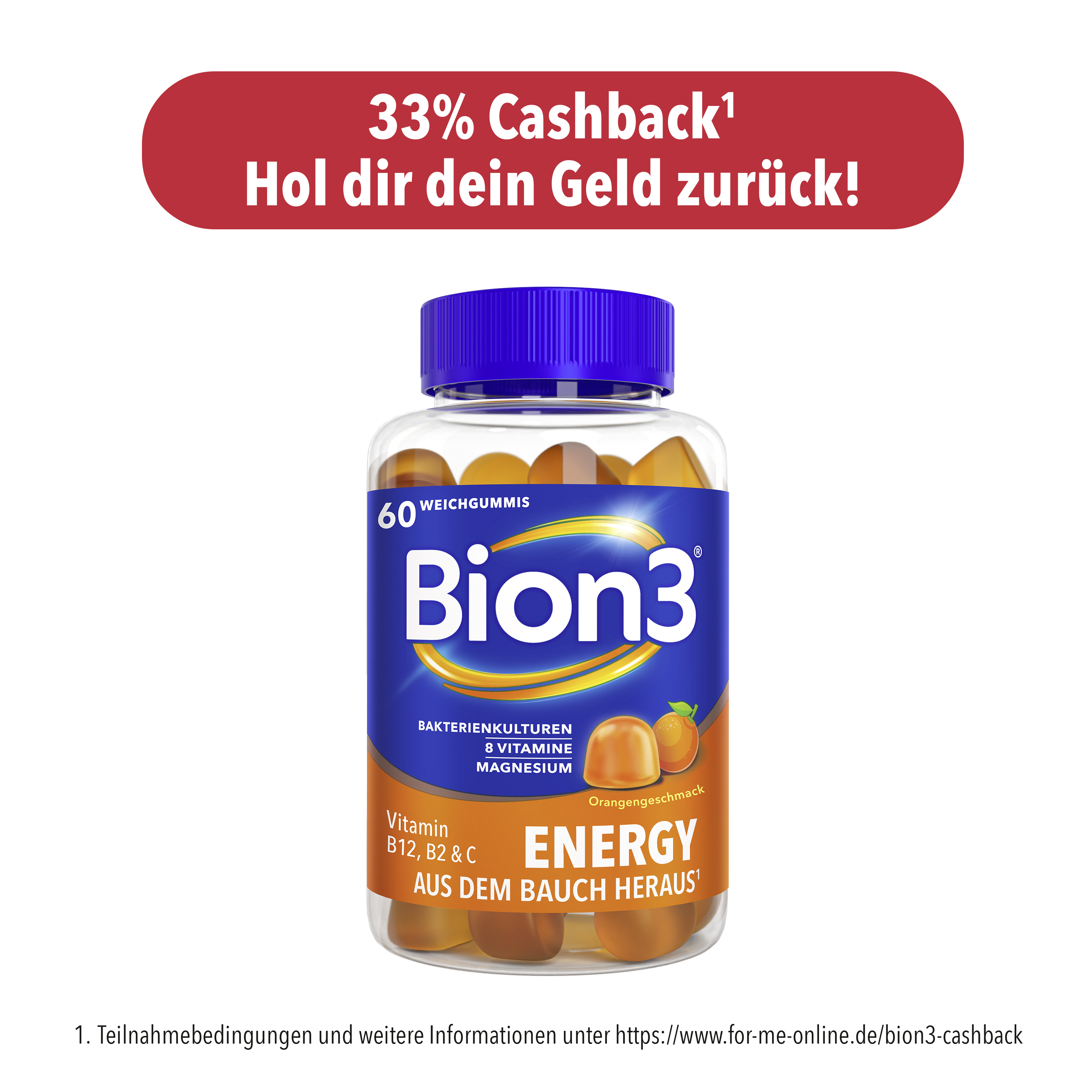 Energie1 aus dem Bauch heraus2!Die neuen Bion3® Energy1 Weichgummis haben eine einzigartige Rezeptur mit einer Kombination aus Mineralstoffen und Vitaminen, die den Darm unterstützen und dafür sorgen, dass dein Energielevel den ganzen Tag hoch bleibt1,2 und mit Bakterienkulturen. Jedes leckere Weichgummi mit Orangengeschmack enthält 8 wichtige Vitamine, darunter B1, B2, Niacin, B6, Biotin und B12 zur Unterstützung des Energiestoffwechsels sowie Vitamin C und Magnesium zur Verringerung von Müdigkeit und Ermüdung. Darüber hinaus enthalten Bion3® Energy1 Weichgummis die Vitamine B2, Niacin und Biotin zur Unterstützung des Darms2 sowie 150 Millionen Bakterienkulturen (B. coagulans), die ausgewählt wurden, dass sie den Darm lebend erreichen.