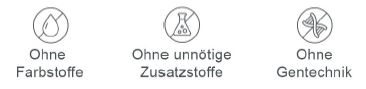 - Frei von Farbstoffen, gentechnisch veränderten Inhaltsstoffen sowie Pestiziden,