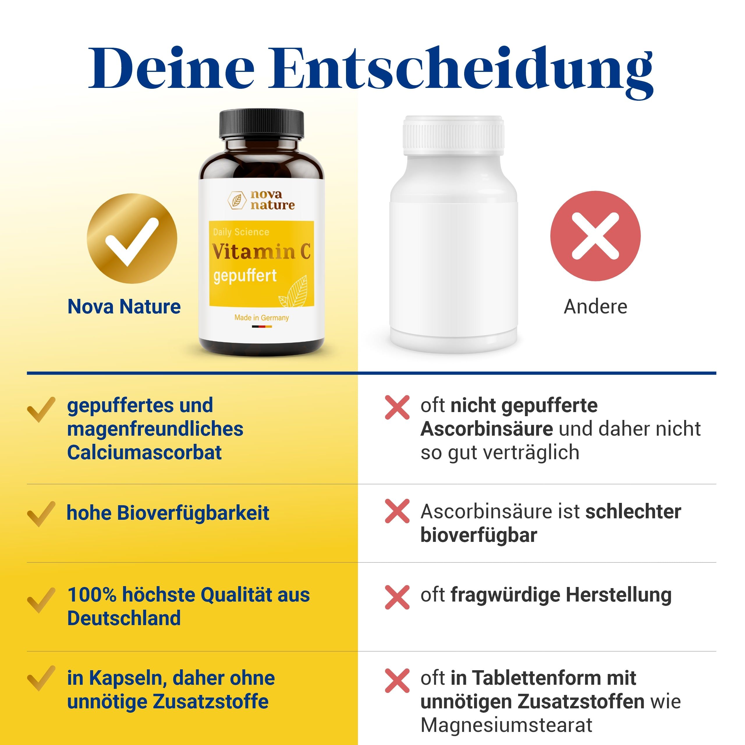 Mit 1 Kapsel am Tag nimmst du 500 mg hochverfügbares buffered Vitamin C zu dir. 2 Kapseln liefern 1000 mg gepuffertes Vitamin C. Im praktischen 6-Monats-Vorrat.
