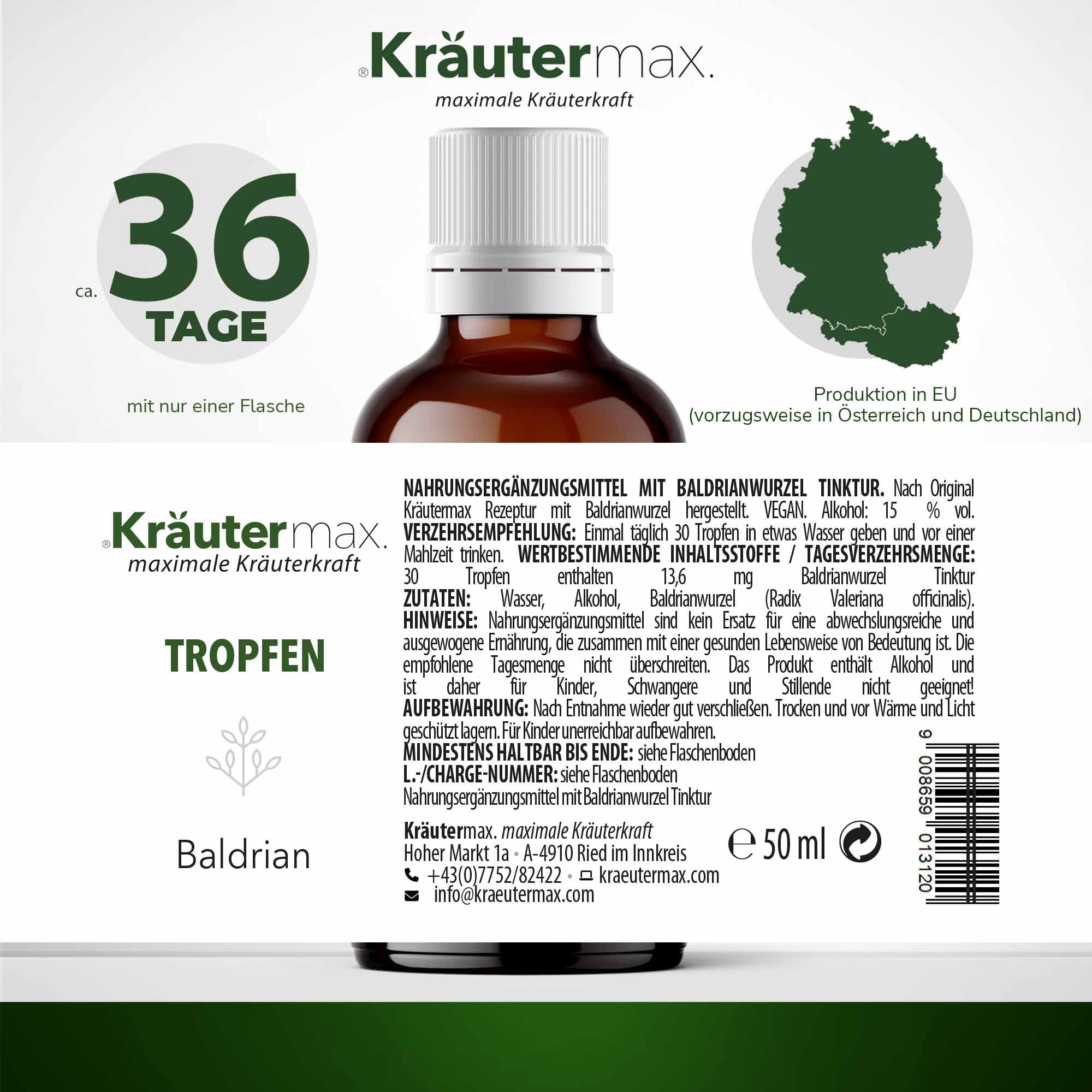 Nahrungsergänzungsmittel mit Baldrianwurzel Tinktur. Nach Original Kräutermax Rezeptur mit Baldrianwurzel hergestellt. VEGAN.