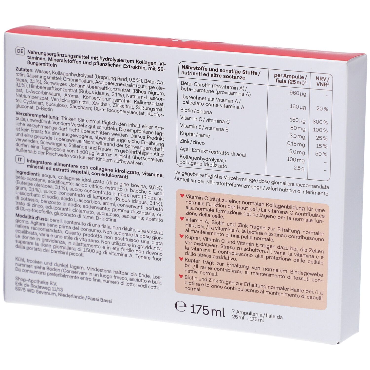 Wasser, Kollagenhydrolysat (Ursprung Rind, 9,6 %), Beta-Carotin, Sauerungsmittel: Citronensaure, Acaibeerenextrakt (Euterpe oleracea, 3,1 %), Schwarzes Johannisbeersaftkonzentrat (Ribes nigrum, 3,1 %), Himbeersaftkonzentrat (Rubus idaeus, 3,1 %), Natrium-L-ascorbat, L-Ascorbinsaure, Aroma, Konservierungsstoffe: Kaliumsorbat, Natriumbenzoat; Verdickungsmittel: Xanthan, Zinkcitrat, Susungsmittel: Cyclamat, Sucralose, Saccharin; DL-α-Tocopherylacetat, Kupfergluconat, D-Biotin
