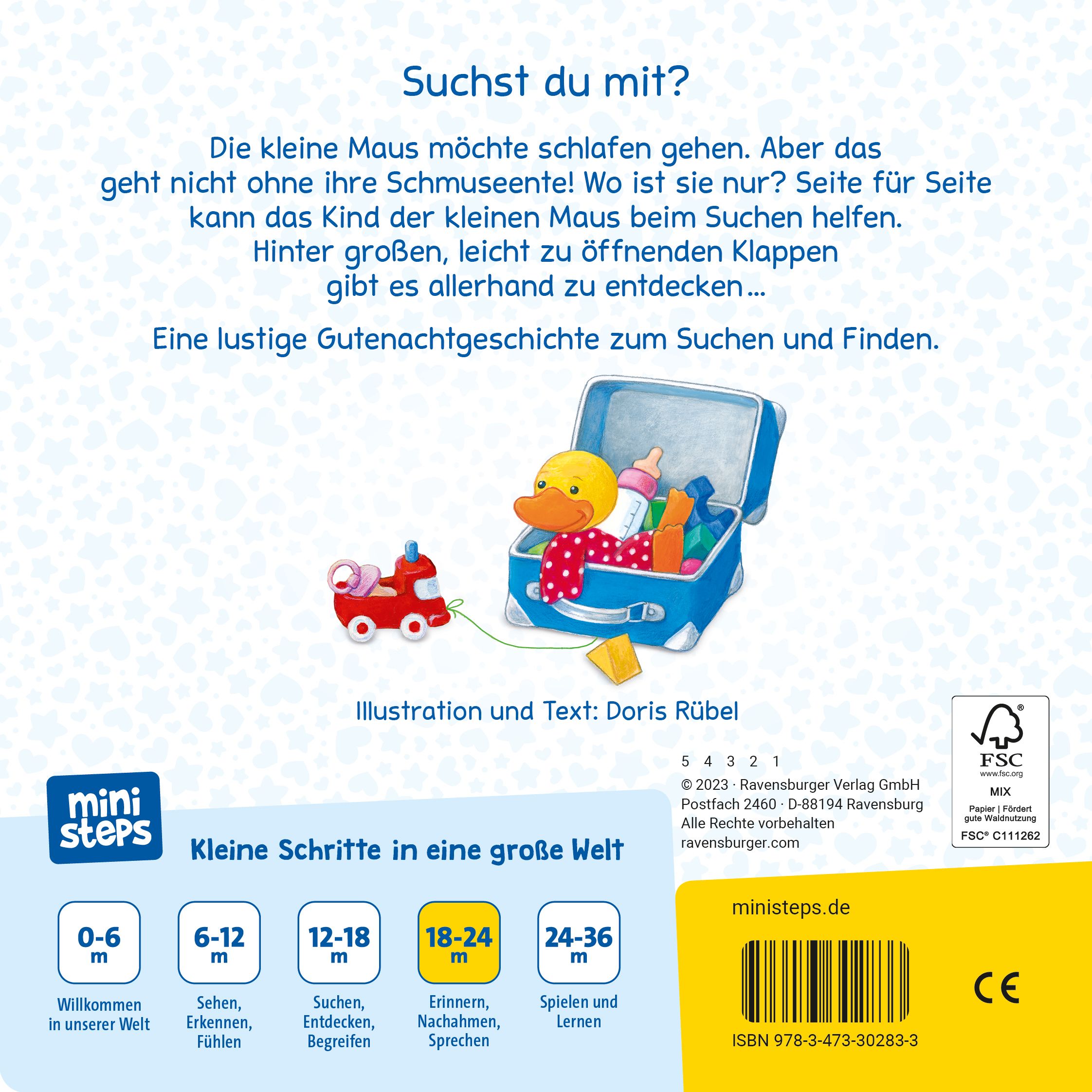 Es ist Schlafenszeit für Maus Mika! Aber wo ist nur die Schmuseente? Ohne die kann Mika nicht einschlafen. Vielleicht unter dem Sofakissen? Im Kleiderschrank? Oder doch in der Tasche?