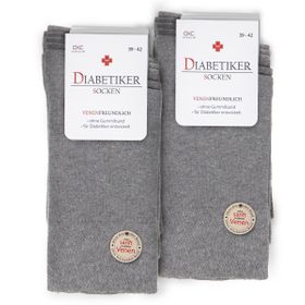An Diabetes erkrankte Menschen haben häufig eine Schwachstelle: Ihre Füße sind anfällig für Verletzungen und anschließende Infektionen der Haut. Um dem vorzubeugen, können in besonderer Stricktechnik hergestellte Socken aus weichen, atmungsaktiven Materialien getragen werden. Unser Shop bietet hochwertige Diabetikersocken in verschiedenen Farben und Größen für Damen und Herren.Ein langfristig erhöhter Blutzuckerspiegel führt oftmals zu Durchblutungsstörungen der Füße, die in der Folge das Krankheitsbild Diabetischer Fuß verursachen können. Eine dadurch beeinträchtigte Schweißproduktion macht die Füße trocken und rissig – sie werden anfällig für Pilzinfektionen. Fehlbelastungen, die Druckstellen, Hornhautbildung sowie schlecht heilende Wunden hervorrufen können, werden durch geschädigte Nerven gefördert. Auch der Druck durch zu enge Strümpfe und Schuhe sowie daraus resultierende Schmerzen werden nur unzureichend wahrgenommen. Betroffene sollten daher ihre Füße täglich auf Veränderungen kontrollieren und geeignete Schutzmaßnahmen ergreifen. Geeignete stabile Schuhe und weiche Strümpfe können helfen, Folgeschäden bei Patienten mit Diabetes zu reduzieren.