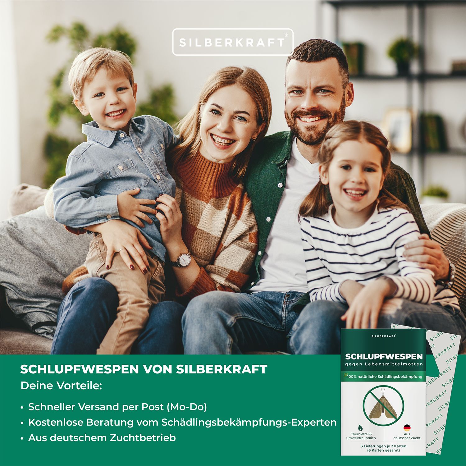 Die Silberkraft Schlupfwespen gegen Lebensmittelmotten sind die natürliche und zuverlässige Lösung gegen Motten in Küche und Vorratsschrank. Lebensmittelmotten können großen Schaden anrichten: Sie befallen trockene Lebensmittel wie Mehl, Haferflocken, Reis oder Nudeln und hinterlassen feine Gespinste und klebrige Verklumpungen. Diese sind nicht nur unhygienisch, sondern machen die Lebensmittel ungenießbar.