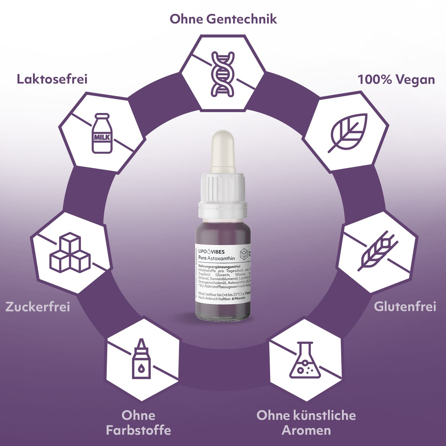 3. Kontrollierte Herstellung: UnserLipoVibesPure Astaxanthin wird in unseren Laboren in Deutschland entwickelt und nach strengen Qualitätsstandards ausschließlich aus pflanzlichen Inhaltsstoffen hergestellt. Es ist vegan und ohne Zucker, Gluten, Laktose und GMO.
