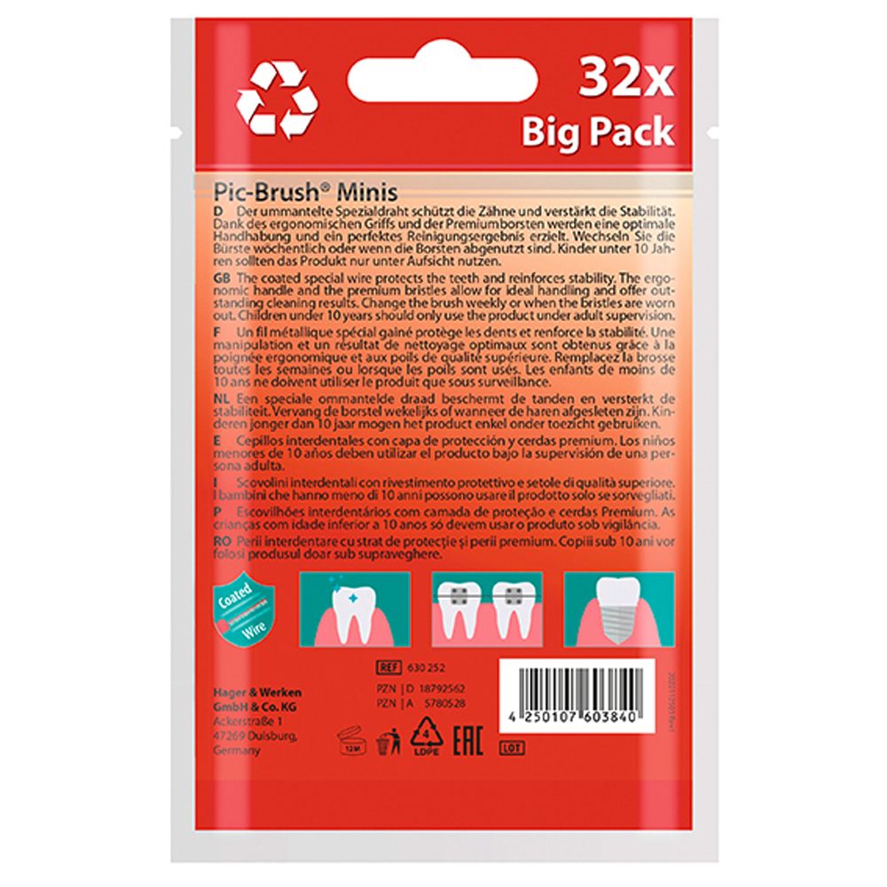 Die miradent Pic-Brush® Minis sind hochwertige Interdentalbürsten der ISO-Größe 2 (PHD 0,9–1,0 mm / ⌀ 0,5 mm), speziell entwickelt für die gründliche Reinigung enger Zahnzwischenräume – auch bei Brackets, Brücken und Zahnersatz. Ob zu Hause oder unterwegs: Diese kompakten Bürstchen sorgen für eine effektive Mundhygiene, wo immer Sie sind.