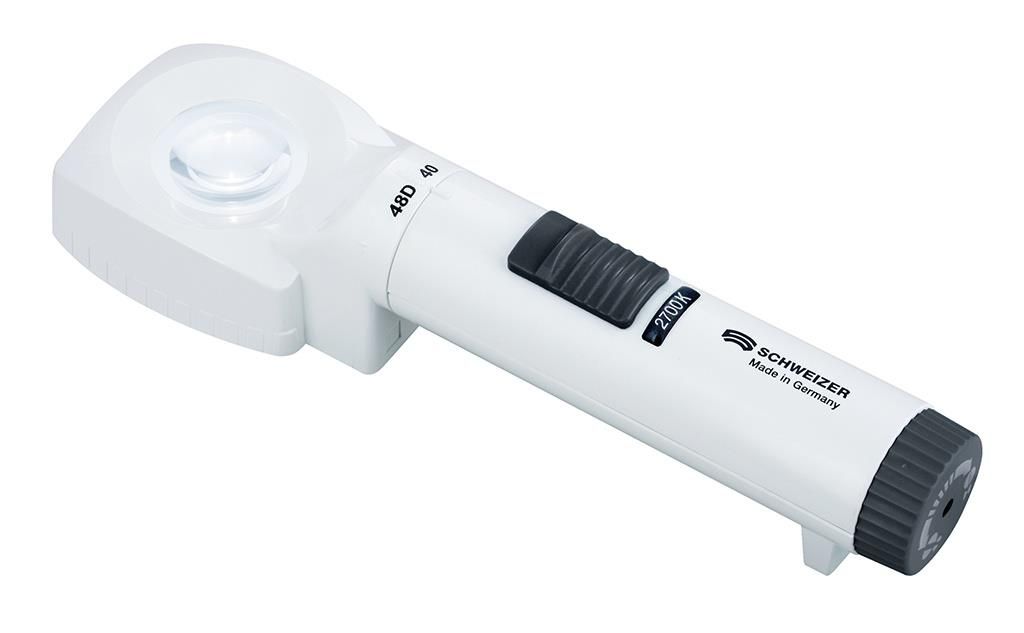 Batteriebetriebene Standleuchtlupe mit 4-Chip-LED in 3 Lichtfarben.